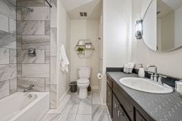 This two-level layout is designed to host up to 10 guests. The home features a master suite with a king-size bed and a private en-suite with a soaking tub and walk-in shower, three bedrooms with queen-size beds sharing bathrooms, and one bedroom with a full-size mattress. Enjoy smart TVs in common areas, high-speed Wi-Fi, a fully stocked kitchen with stainless steel appliances and cooking essentials, a dining table that seats 6, fresh bed and bath linens in every room, a welcome basket with snacks and Keurig K-Cups, and a foosball table.
