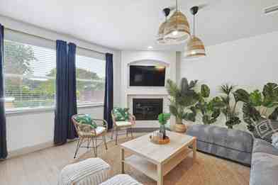 This modern, airy, and sophisticated vacation home features a fully equipped kitchen with stainless steel appliances and granite countertops, a dedicated dining area, and a living area with comfortable seating, a flat-screen TV, and high-speed Wi-Fi. Enjoy the cinema room with comfortable seating and a foosball table. The backyard features an outdoor swimming pool, loungers, a conversation set, a patio, an outdoor BBQ grill, a firepit with chairs, a relaxing jacuzzi, and a fully fenced yard for your privacy.