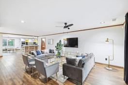 This home caters to both short-term and medium-term stays, making it an excellent choice for corporate housing needs. The fully equipped chef’s kitchen is a culinary delight, featuring stainless steel appliances, granite countertops, and ample counter space. The open-concept dining area seats 8+ guests, perfect for socializing. The tastefully furnished living room, designed by a professional interior designer, offers comfortable seating, flat-screen TVs, and high-speed Wi-Fi.