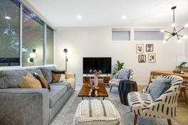 Discover this Ballard townhome: centrally located, well-connected, and meticulously cleaned. This spacious brand-new townhome spans four stories, including a rooftop deck, and offers 3 bedrooms and 2.5 bathrooms, comfortably sleeping up to 8 guests. The first floor features a living room with a queen sleeper, a kitchen, dining area, and a half bath, while the second floor houses two bedrooms with queen beds and a bathroom. The primary bedroom with a king bed and ensuite bathroom is on the third floor, and the fourth floor boasts a rooftop patio with outdoor seating. The home is air-conditioned on the first and third floors.