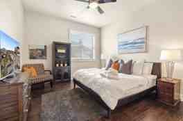 Upon entry, you'll be greeted by an open living room complete with comfortable seating for everyone. The Smart TV with cable and streaming services ensures you won't miss the big game. The fully equipped kitchen is ready for you to whip up your favorite meals, and the bar area with four high-top chairs is perfect for dining. Two sets of double doors lead to the outdoor living area, featuring patio seating and a BBQ grill. The condo offers four beds: a king bedroom with a closet, dresser, and en-suite bath, a second bedroom with a queen-size bed and nearby bathroom, and an upstairs shared bedroom with two queen beds and a walk-in closet.