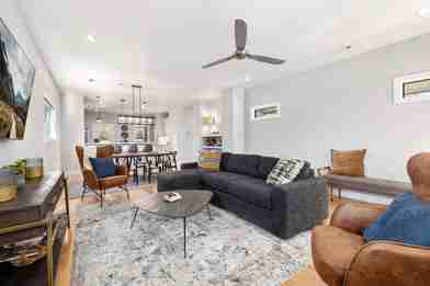 This home features a fully stocked kitchen with high-end amenities, cookware, and supplies, as well as a drip coffee maker, a Keurig, high-end appliances, and plenty of built-in storage. The bright, open-concept living room has an overstuffed sectional, two lounge chairs, an LG Smart TV, and modern flair. There is also a six-top dining table, a bar, and four barstools. Enjoy the convenience of a washer and dryer, and extra towels and linens are provided during your stay.