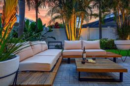 Inside, vaulted ceilings, natural textures, and warm wood tones create a bright, airy atmosphere. The thoughtfully designed floor plan allows for effortless gathering, whether you're lounging in the living room, prepping meals in the fully equipped kitchen, or catching up over a long dinner around the table. Open the double French doors to find your private outdoor oasis: a fully fenced backyard with tropical landscaping, glowing evening lighting, and plenty of space to lounge, dine, or simply enjoy the Florida breeze. Highlights include seamless indoor/outdoor living with a fully furnished backyard, covered outdoor dining for six with fans and lighting, a sleek lounge area, smart TVs, fast Wi-Fi throughout the home, and keyless entry. The apartment also offers a washer/dryer, towels, bed linens, a Nest thermostat, a Nest Doorbell camera, Google Home Minis, and Phillips Hue LED lights for ambiance. Parking is available with driveway space for two vehicles and garage parking for one vehicle.