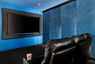 The open-plan living/dining space features white marbleized floors and bright accent furnishings, including two cozy sofas and two plush chairs. The sleek white table comfortably seats 10. The kitchen is fully stocked with tableware and cookware and features a breakfast bar with 5 stools, a French door fridge with freezer drawer, a double basin sink, and a 4-burner stove. Enjoy the movie theater with a 98” TV and 7 relaxing recliner seats, plus a rec room with arcades. The game loft offers a foosball table, a poker table with six chairs, a jukebox, wall scrabble, shuffleboard, and a big TV that doubles as a gaming station.