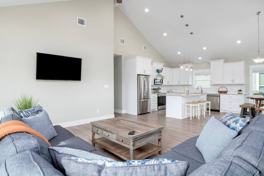 Inside, the fully equipped kitchen features stainless steel appliances and a large kitchen island, perfect for preparing meals together. Fast internet keeps you connected, while the outdoor dining space is perfect for enjoying coastal breezes. Two of the bedrooms feature two queen beds each, while the third boasts a king-size bed in the master suite, complete with a spacious private bathroom. A second full bathroom is located in the hallway between the queen rooms, while the third bathroom is past the laundry room, providing easy access for everyone. Each room includes a smart TV for streaming.