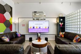 This condo features two convertible meeting/bedrooms with 65-inch 4K TVs and queen-size Murphy beds in both meeting rooms. The living room includes two leather couches with queen-sized pull-out mattresses and an 85-inch 4K Samsung TV. The fully equipped kitchen boasts cutting-edge appliances, and the modern bathroom includes a washer/dryer combo, perfect for longer stays or last-minute laundry. High-speed Wi-Fi and air conditioning ensure your comfort.