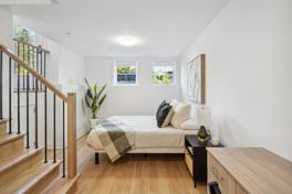 This modern studio features a spacious ground-floor living area, flooded with natural light, ideal for unwinding after a long day of exploring the city. Relax in the stylish living area with a flat-screen TV and comfortable sofa. Cook with ease in the fully equipped kitchen featuring sleek, modern appliances and enjoy meals at the elegant dining table, perfect for morning coffee or dinner gatherings. The cozy basement-level bedroom is designed for ultimate relaxation and quiet, providing an ideal sleeping environment secluded from the main living space for added privacy.