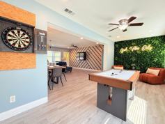 This home features a fully equipped kitchen, a cozy living area with a comfortable sofa and large Smart TV, and a dining table ideal for meals, games, or trip planning. Enjoy the game room with board games, arcade games, and life-size games, as well as an outdoor playground for kids. The fully fenced backyard includes outdoor furniture and a dining area. A washer, dryer, iron, and drying rack are also available, along with air conditioning, central heating, and a ceiling fan for year-round comfort.