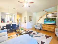 This spacious two-story layout is perfect for families or multi-generational groups. The townhome features fresh, modern décor with a clean and cozy ambiance, a comfortable living area with a smart TV, and smart TVs in all bedrooms for personalized entertainment. The fully equipped kitchen includes stainless steel appliances and all cooking essentials. There is also an open dining area with seating for the whole group, high-speed Wi-Fi, central air conditioning, and a washer and dryer in unit.