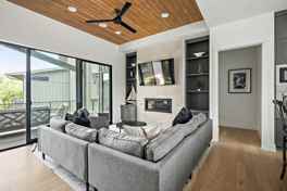 This home features a ground-floor patio with an outdoor smart TV and a queen sofa bed. The second floor includes a stylish living area with an inset fireplace, a sectional, and a large smart TV, along with a chef’s kitchen equipped with stainless steel appliances, a five-burner gas range, and a beverage fridge. The top floor offers a second lounge with sofa seating and smart TV. Enjoy central air conditioning, complimentary Wi-Fi, and a full-size washer and dryer.