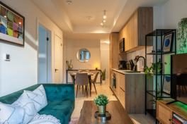 This apartment features a queen-size bed with blackout curtains, a 12-inch orthopaedic mattress, and a lounge sofa with an inflatable mattress available upon request. Enjoy stunning light and views from the floor-to-ceiling windows and relax on the private balcony with patio lights. The fully equipped kitchen is stocked with all cooking essentials and full-size appliances, including a coffee maker. An en-suite washer and dryer are included for your convenience.