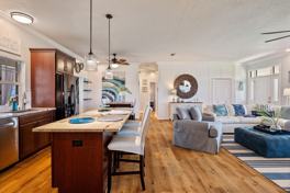 This home is designed for relaxation and entertainment, featuring a luxurious open floor plan with a large kitchen and center island. The cozy family room includes a large-screen smart TV and comfortable seating. The master suite boasts a king-size bed and a large-screen TV, along with a master bathroom featuring a freestanding tub and a walk-in shower. A separate kids' room with a twin bed and trundle is included in the master suite. The other two bedrooms feature queen-size beds and share a beautifully designed second bathroom. The fully stocked kitchen includes dishes, pots, pans, and cooking utensils. Enjoy the in-ground electric pool with the option to be heated, a large covered and screened area around the pool, an outdoor table, lounging chairs and loungers, an outdoor gas grill, and a fire pit area for evening gatherings. The expandable dining table comfortably seats 8.