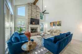 Our home caters to both short-term and medium-term stays, making it an excellent choice for corporate housing needs. Whether you find yourself temporarily displaced from your home or require accommodations for your team during an extended project in our area, we provide a welcoming and comfortable "home away from home" experience. The stunning exterior will be enough to convince you that you’ve made a great choice. The front of the home exudes charm with the brick exterior, lots of trees, a water fountain, large lawn, and gorgeous landscaping. Feel free to park your cars under the carport to keep them in the shade and away from any rain. The living area is a standout with vaulted ceilings and floor-to-ceiling windows, lending a bright and airy atmosphere. Stand in the middle of the living area and you can get great views on both sides — the water fountain in the spacious front yard or the sparkling pool in your backyard. The room is luxurious yet cozy, accented with the classy sofas, rug, and décor. Plus, you’ll love cozying up by the beautiful fireplace. A more casual hangout spot is the second living area on the upper floor that comes equipped with cushy furniture and a foosball table. And a sweet extra this home offers is your very own movie room with a comfy sectional sofa and movie posters decorating the walls. The kitchen has lots of counter space, beautiful tiles, and stainless-steel appliances. It comes fully equipped with everything you might need whether you’re preparing your own fresh meals or just enjoying some delicious local takeout. Have your meals in the cute breakfast area looking out into the backyard or your whole group can have their food together around the table in the beautifully decorated dining room. You’ll have 5 spacious bedrooms available, all furnished with cozy high-end furniture, lavish linens, and beautiful décor. You’ll also have 4.5 bathrooms so no one will have to fight over bathroom time. They are all soothing with neutral finishes and nicely remodeled with gorgeous counters, huge walk-in showers, and double vanities. You will love the outdoor spaces this home offers. There’s a cozy balcony with great seating and a relaxing swing egg chair. It’s a great spot to start or end your day. The backyard has a covered patio area and an outdoor dining area if you want to enjoy your meals while enjoying the weather.