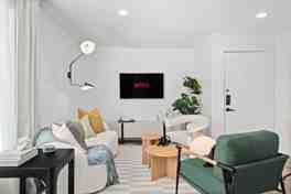 This apartment offers a fully equipped kitchen with stainless appliances, including a fridge, freezer, stove, oven, dishwasher, microwave, kettle, and coffee machine. It also features in-suite laundry, modern decor and furnishings, a round dining table with place settings and dining utensils, an open-concept layout, a living room with a couch, sofas, coffee table, and a flat-screen TV with high-speed Wi-Fi. The bedroom offers a queen bed with pillows and linens, a bedside dresser and lamp, and a wall-mounted TV with a light-up headboard. The bathroom features a glass walk-in shower, spa-like finishes, and essential toiletries.