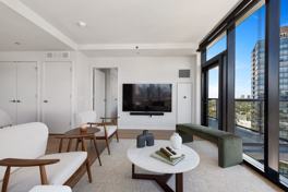 This apartment sleeps four, with two queen bedrooms and two baths. It features a fully equipped chef's kitchen with complimentary Nespresso and tea, a Sonos sound system, and smart TVs. A Pack & Play is available upon request.