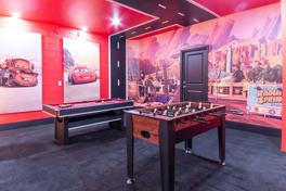 This beautifully designed home combines elegant comfort with whimsical charm. The open-concept living space features a stylish lounge area and a fully equipped gourmet kitchen with modern appliances. There is also a Cars-themed game room, complete with a pool table, foosball, and interactive games. The home also features three enchanting themed bedrooms: a Harry Potter Room, a Mickey Mouse Safari Room, and a Minions Room. Enjoy the convenience of an in-home laundry room with a washer and dryer and complimentary Wi-Fi.