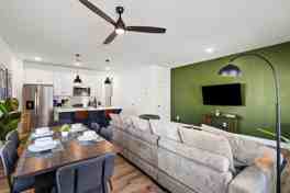 This modern, open-concept home blends comfort and functionality with high-quality finishes. Key features include a spacious living area with modern furnishings, a fully equipped kitchen, and an in-unit washer and dryer with starter detergent. The kitchen includes a refrigerator, oven, stove, microwave, dishwasher, coffee and tea station, pots, pans, utensils, knife set, cutting board, plates, bowls, cups, blender, toaster, trash bags, and dishwasher and laundry pods. Entertainment is provided by a 55” 4K Smart TV in the living room with access to popular streaming platforms. The bedrooms feature memory foam mattresses and premium linens, and the spa-style bathrooms include high-pressure showers, towels, shampoo, conditioner, body wash, hand soap, and a hair dryer.
