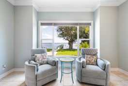 The living area is brightly lit and fashionably decorated, perfect for gathering to watch TV or catching up with friends, all while enjoying beautiful waterfront views. It features high ceilings, oversized leather couches, and a high-definition TV with high-speed Wi-Fi for your entertainment needs.