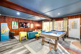 This stunning retreat offers a fully stocked chef’s kitchen with high-end appliances, a large refrigerator, ample cabinetry, and a large island with high seating. The living room features a 65" smart TV, a large plush sofa, and modernized lighting in an open-floor concept connecting to the kitchen and dining area. For entertainment, there is a game room with a pool table and arcade games. Enjoy the resort-style backyard with a basketball court, fire pit, BBQ grill, putt putt, corn hole, giant Jenga, and Connect 4. This home also includes a family-friendly pack n play and high chair.