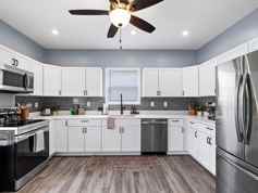 Welcome to this spacious and stylish 4-bedroom retreat, where comfort meets convenience. This inviting home boasts 3 full bathrooms, ensuring ample space for your group to unwind and refresh after a day of adventures. The first floor features a bedroom with a twin trundle bed, a full bathroom with a tub and shower combination, and a washer and dryer. Additionally, the first floor includes a living room, a dining room with seating for 8, and a large kitchen with plenty of counter space for prepping your favorite meals. Upstairs, you will find the remaining 3 bedrooms, one with a queen bed and the other two with king beds. The master bedroom features a canopy king bed, an ensuite bathroom, a walk-in closet, and a small balcony with seating for two. An additional full bathroom is also located on this floor.