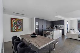 This space embodies comfort and sophistication with its sleek design, floor-to-ceiling windows, and custom Italian kitchen featuring marble finishes. The bright, open-concept living area includes a comfy sofa and breathtaking views. The fully equipped modern kitchen features marble finishes, island seating, and premium appliances. A spacious dining area is ideal for everyday meals or entertaining. Enjoy the convenience of in-suite laundry with a full-size washer and dryer. Fresh towels, quality linens, and essentials are provided for a comfortable stay. The expansive private patio features lounge seating and a barbecue, perfect for outdoor dining and relaxation.