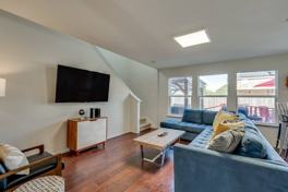 The primary bedroom on the second floor features a king-size bed and an en-suite bathroom. The second and third bedrooms on the second floor each have a queen bed, while the fourth bedroom offers two single beds. The fifth bedroom on the first floor is equipped with two queen-over-queen bunk beds and a queen pull-out couch. The home includes a full bath attached to the primary bedroom, a shared bathroom on the second floor with a shower/tub combo, and a half bathroom on the first floor conveniently located near common areas. Enjoy the chef’s kitchen with an oversized island that seats eight, perfect for group gatherings. High-speed Wi-Fi and smart TVs ensure seamless streaming and connectivity, and family-friendly amenities include a crib, highchair, and laundry essentials.