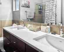 This rustic and elegantly styled townhome features a large, fully fenced outdoor patio, fast Wi-Fi, a fully equipped kitchen, a brand new washer and dryer, and Roku-fitted TVs. Radiant heating is included. The full kitchen is well-appointed and includes stainless steel appliances as well as a breakfast bar. The living area is stylish and cozy, featuring a high-quality red suede American Leather queen sleeper sofa, board games, and a unique wood slab coffee table. An additional balcony adjoins the living room. The master bedroom has its own en-suite bathroom with two sinks and a stylish shower, as well as its own personal balcony.