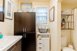 The entrance to your unit is on the east side of the building, and you will know it by seeing the bistro tables like you see in the listing photos, as well as the newly painted teal door.