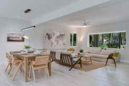 This property features a fully stocked kitchen, a tranquil neighborhood close to downtown and Hollywood Beach, BBQ and outdoor seating, and a large yard. The master bedroom offers a king-size bed, TV, and an en-suite bathroom with a modern shower. The second bedroom includes a queen bed and ample storage space, while the third bedroom features two single beds, a desk, and ample storage space. The living room, filled with natural light and plenty of seating, is perfect for movie nights and flows seamlessly into the dining area.