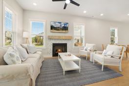 Upon entering the home, you'll find an open concept living room, kitchen, and dining space adorned with inviting modern decor. This area features plush seating, a large Smart TV, an operable gas fireplace, a dining table for four, and a bar cart for crafting your favorite vacation drink. The fully stocked kitchen is equipped with all the amenities needed to create a meal, baked goods, or just a great cup of coffee. For sleeping arrangements, choose from a king suite with a king-size bed, Smart TV, and full attached bathroom, a second king suite with similar features, or the queen-size pull-out bed in the living room. This home also offers board and card games, as well as a washer and dryer for guest use.