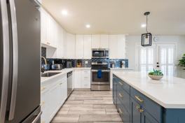 The home features an open-concept living area, modern amenities, and ample space for relaxation. The fully equipped kitchen boasts stainless steel appliances and granite countertops, along with a breakfast bar and dining table. For entertainment, there is a large flat-screen TV, plush sofa, and cozy seating area. Fresh towels and toiletries are provided in all three beautifully designed bathrooms, and a laundry room is available for guest use.