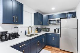 The guesthouse features a bright and cozy living area with a sofa and large windows. The kitchen is equipped with a full-size fridge, stove, microwave, air fryer, coffee maker, and basic essentials. The full bathroom has a walk-in shower.