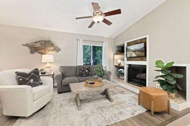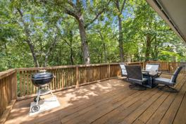 Step inside to find an open concept living room, kitchen, and dining space that creates the perfect setting for memorable gatherings. The living room features a large Smart TV with all your favorite streaming channels, plush seating, and large windows overlooking the wooded backyard. The kitchen is fully stocked with everything you'll need to prepare a meal or just a good cup of coffee. Outside, enjoy the fresh air or dine al fresco on the patio in the large, peaceful backyard. When it's time to retire for the night, choose from one of three private bedrooms: the primary bedroom upstairs with a king-size bed and en-suite bathroom, the second bedroom downstairs with a king-size bed, and the third bedroom downstairs with two queen-size beds. The living room couch also converts into a queen-sized bed.