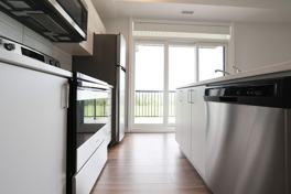 Oversized windows in this corner unit let in tons of natural light. Unit has a very large, private balcony off of kitchen. Most windows and balcony have a serene view of open greenery – the Trans-Canada Trail!