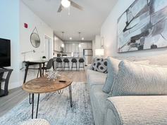 This pet-friendly, fully furnished 2-bedroom, 2-bath apartment offers interior views of the pool and courtyard. Enjoy access to a state-of-the-art gym, clubhouse, and other luxury amenities. The apartment includes a work desk and chair, complemented by lightning-fast wireless Internet.