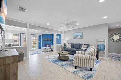 The home boasts a spacious open floor plan, featuring two living rooms. Catch all the excitement of the game on the big screen TV while the kids have a blast playing board games in the den. The large and updated fully stocked kitchen comes complete with a massive island, ideal for preparing delicious meals or simply enjoying a casual breakfast. After a day soaking up the sun, you'll appreciate the rejuvenation provided by the three beautifully remodeled bathrooms. And when it's time to rest, the three comfortable bedrooms ensure a blissful night's sleep.