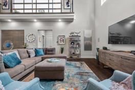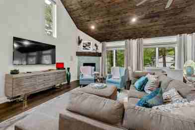 The apartment boasts a spacious open-concept living area with a large TV, ample seating, and a garage door leading to the rooftop balcony. The fully stocked kitchen includes high-end amenities such as a Keurig, air fryer, blender, and kettle. The dining area comfortably seats six, with additional seating at the kitchen bar. The vaulted wood panel ceiling adds a touch of elegance to the living room.
