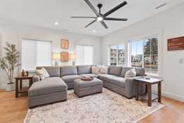This modern and comfortable townhome offers a relaxing stay. The open-concept living area features a sleek kitchen equipped with quartz countertops, white cabinetry, and stainless steel appliances, including a French door refrigerator. For your convenience, a washer and dryer are also provided.