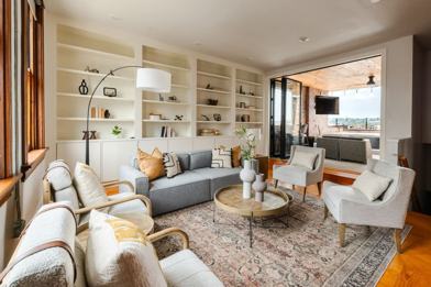 Designed for ultimate comfort and style, this penthouse boasts a luxury kitchen equipped with marble counters, high-end appliances, and a large island with dining for eight. The living room offers a cozy retreat, while the beautiful rooftop patio provides sweeping city views, perfect for relaxing in the hot tub or entertaining.