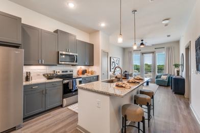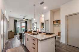Step into a stylish 1-bed, 1-bath home with open layouts featuring quartz countertops, kitchen islands with USB outlets, spacious walk-in closets, and a private balcony or patio. Many units include high ceilings (10–15 ft), wood-style flooring, and keyless entry for a touch of luxury.
