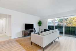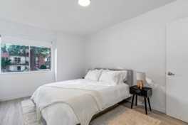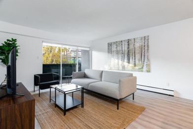 The space within the home is denoted by bright whites along the walls, contemporary furnishings, and monochrome design, all tied together by way of a brand-new renovation. Hardwood floors blend perfectly with the wooden furniture accents to invoke a clean and refreshing modern design. The living room is spacious, offering comfortable furniture and entertainment value through the 4K Smart TV. The windows allow for natural light to enter the home, and the patio offers a chance to step outside and enjoy the fresh air of BC. The kitchen is stocked with all necessary essentials to enjoy home-cooked meals and benefits from an optimal layout for efficient use. The bedroom is large and comfortable, characterized by white textures and cozy bedding. Ample closet space is present for storing belongings.
