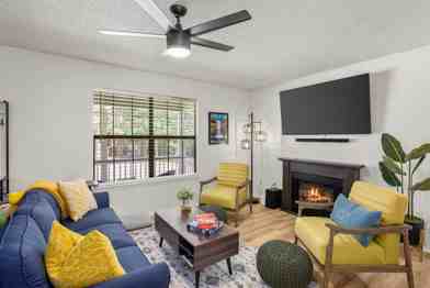 Welcome to your Bella Vista sanctuary! This single-level home features an open-concept living area with a smart TV, electric fireplace, and comfortable seating. Two serene bedrooms—each with a queen bed plus trundle—sleep six guests. The fully equipped kitchen includes stainless appliances, cookware, spices, and a coffee bar. After a day outdoors, unwind on the back deck with a barbecue or soak in the private hot tub while you watch the stars. The fenced yard is perfect for kids and pups, and the garage includes a bike repair station and secure storage for your gear.