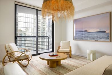 The suite boasts a fully equipped kitchen, perfect for preparing your favorite meals, and an in-unit washer and dryer for your convenience. The design is inspired by the natural world, providing a serene and calming atmosphere.