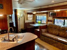 This adorable camper is a spacious place to call home for a night or a few, with everything miniature-sized yet cozy and comfortable. The full-sized bed accommodates two adults, with linens and pillows provided. A small TV offers entertainment, and the kitchen includes a gas range, sink with running water, microwave, and a small fridge and freezer that work efficiently. Coffee, creamer, and sugar are provided for your convenience. The mini bathroom has a very small tub and shower, with a shower wand for easier use, though taller guests should be aware of the 5'8'' max height in the shower.