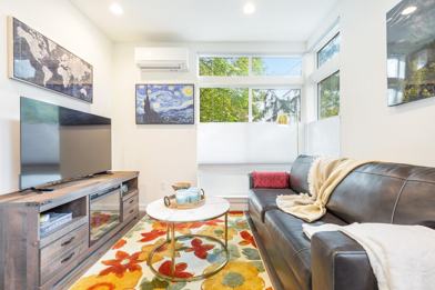 The home features floor-to-ceiling windows providing natural light, with room-darkening shades for a restful sleep. The kitchen is fully stocked with appliances, cookware, silverware, servingware, spices, and a Keurig coffee and tea maker.