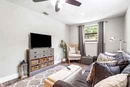 Welcome to "The Graystone," a stylish urban retreat in Tampa, perfect for families or groups. This step-free home features a king master suite, three additional bedrooms, and a versatile second living room for families. Enjoy a fully equipped kitchen, smart TVs, and a private backyard with a hot tub (seasonal from November to May) and children's play set. Experience comfort and convenience in the heart of the city, making your stay both relaxing and memorable.