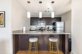 This apartment features an open-concept living area and a state-of-the-art kitchen equipped with stainless steel appliances, granite countertops, a dishwasher, microwave, range, and refrigerator. A record player with a selection of vinyl records adds a nostalgic touch. A washer and dryer are in-unit, but currently not available, pending replacement.