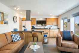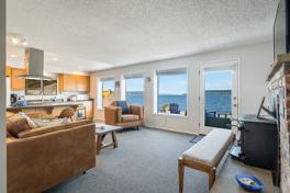 Begin your tour of this recently renovated waterfront haven in the open-concept living area, where the modern and vibrant living room decor blends seamlessly with the fully equipped kitchen and cozy dining area. After a day of exploring the breathtaking waterfront and natural attractions, relax in this spacious and inviting room, filled with natural light that floods through the large windows, highlighting the elegant floors and tasteful decor. The kitchen is fully equipped with top-of-the-line appliances and ample work areas, making it easy to whip up delicious home-cooked meals for the whole group. Whether you're preparing a quick breakfast or a hearty dinner, this well-appointed kitchen has everything you need to satisfy your culinary cravings.