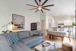 This home features a living room with a large sectional and smart TV, a fully equipped kitchen, and a dining set for 6 with additional bar seating. Enjoy the convenience of a washer/dryer, ironing board, and iron. Relax on the outdoor deck with dining, loungers, and a conversation set.