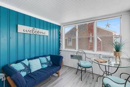 The heart of this home is the open-concept living area, where the kitchen seamlessly blends with the living room. Prepare gourmet meals in the stunning kitchen, complete with sleek white cabinetry, high-end appliances, and a charming retro-style refrigerator. The adjacent living space is perfect for entertaining, with comfortable seating and beachy decor that sets the mood for relaxation. Both bedrooms are thoughtfully designed to provide serene retreats after long days at the beach. The primary bedroom, a generous 100 sq. ft., boasts soothing blue hues and ample natural light, creating a peaceful oasis. The second bedroom, with its nautical theme and cozy twin beds, is ideal for guests or children. The bathroom is a vision of coastal elegance, featuring a clean, crisp design with modern fixtures and subtle beach-inspired accents. Energy-efficient ceiling fans and plenty of windows ensure the space stays cool and breezy, embodying the laid-back beach lifestyle. Grill, dine, or just enjoy summer stars from your private back deck, which has a large gas grill and dining table that comfortably seats six.